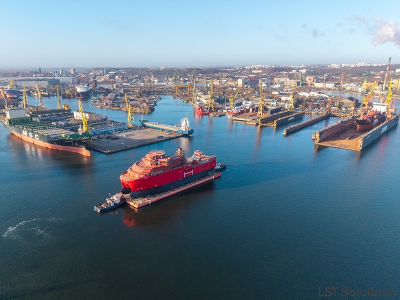 The floating dock structure, measuring 128 m in length, 30.5 m in width, 11 m in height, and weighing 2500 tons, built on the quay, was lifted to install the skidding foundation, and then moved using the skidding method onto a submersible pontoon. The dock structure was of such dimensions that it extended beyond the pontoon’s outline. The entire assembly was towed to a depth agreed upon with the Port Authority, where the pontoon was controllably submerged until the dock achieved buoyancy. This is an innovative method for launching vessels, bypassing the use of shipyard docks. In the final stage of the operation, all units were safely towed and moored at the client’s quay.