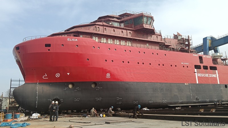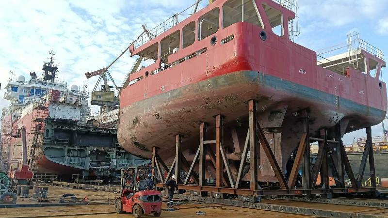 Steel catamaran of impressive size (90 m length and weight 3600 tons) was transferred from the shipyard quay onto a transport pontoon, properly secured, and towed to a floating dock, where the vessel was launched. The service was carried out comprehensively, from concept to full execution. Each stage required experience, expertise, and close coordination among all involved parties to meet the highest standards.