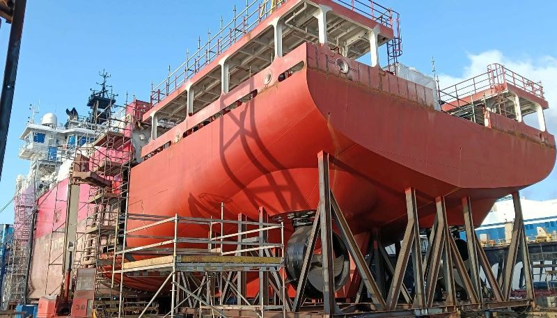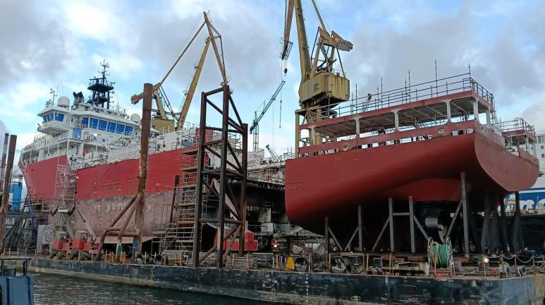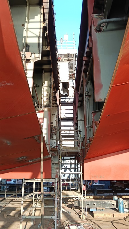 Przeprowadziliśmy złożoną i niezwykle wymagającą przebudowę statku – począwszy od całkowitego usunięcia istniejącej rufy do budowy i montażu zupełnie nowej konstrukcji. Stary blok został starannie odcięty i przetransportowany na nabrzeże. Nowa rufa została przetransportowana na pontonie, precyzyjnie wypoziomowana i połączona ze statkiem. Ta kluczowa operacja wymagała nie tylko precyzji inżynierskiej, ale także perfekcyjnej koordynacji na każdym etapie. Dzięki temu statek został wyposażony w zupełnie nowe systemy napędowe i spełnienia współczesne wymagania operacyjne. Od koncepcji do pełnej realizacji – zrealizowaliśmy cały proces.